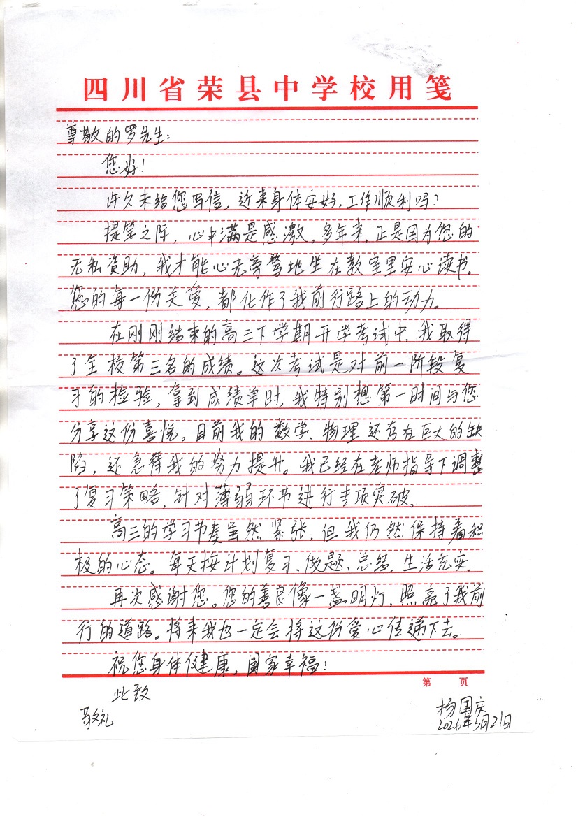 【原创】 受助学生反馈信:杨国庆