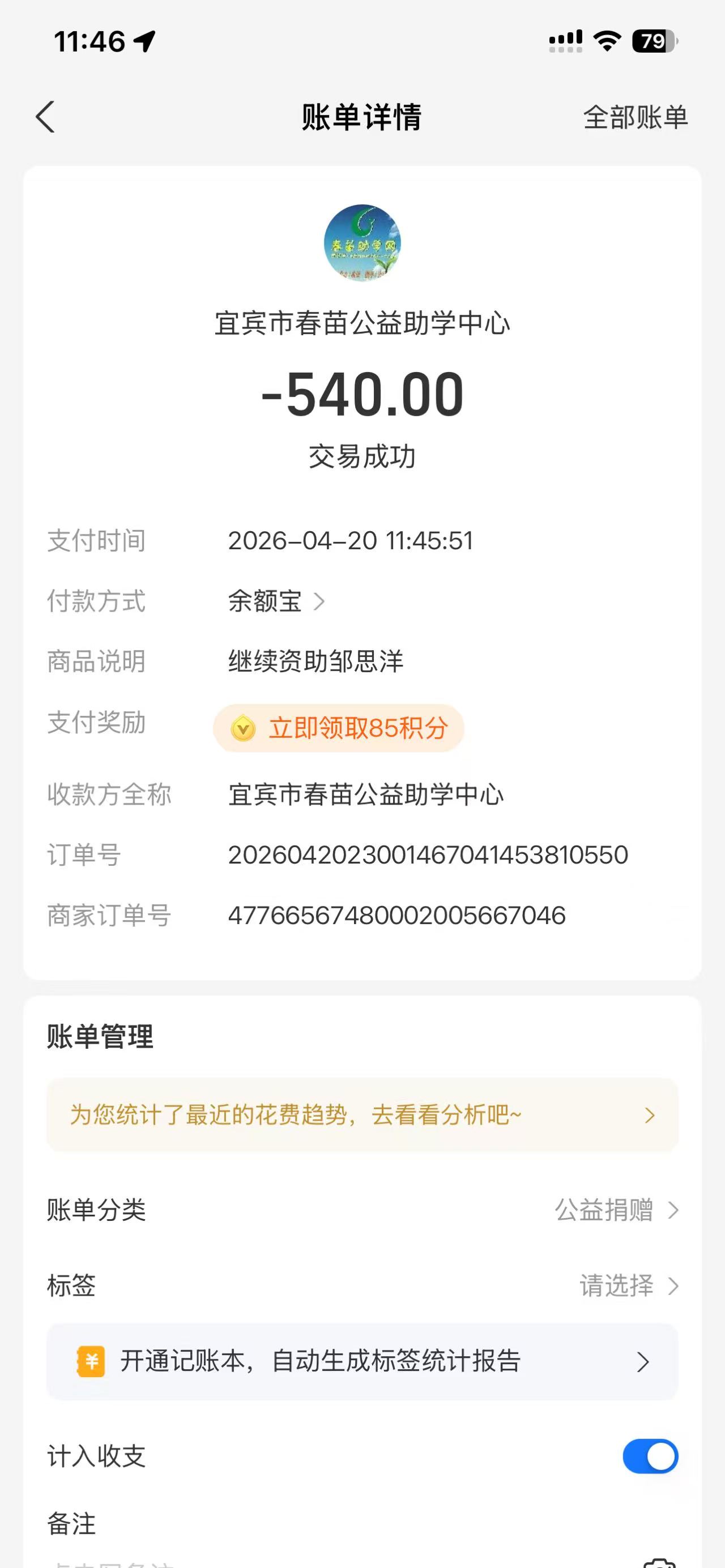 【原创】 继续资助邹思洋助学款