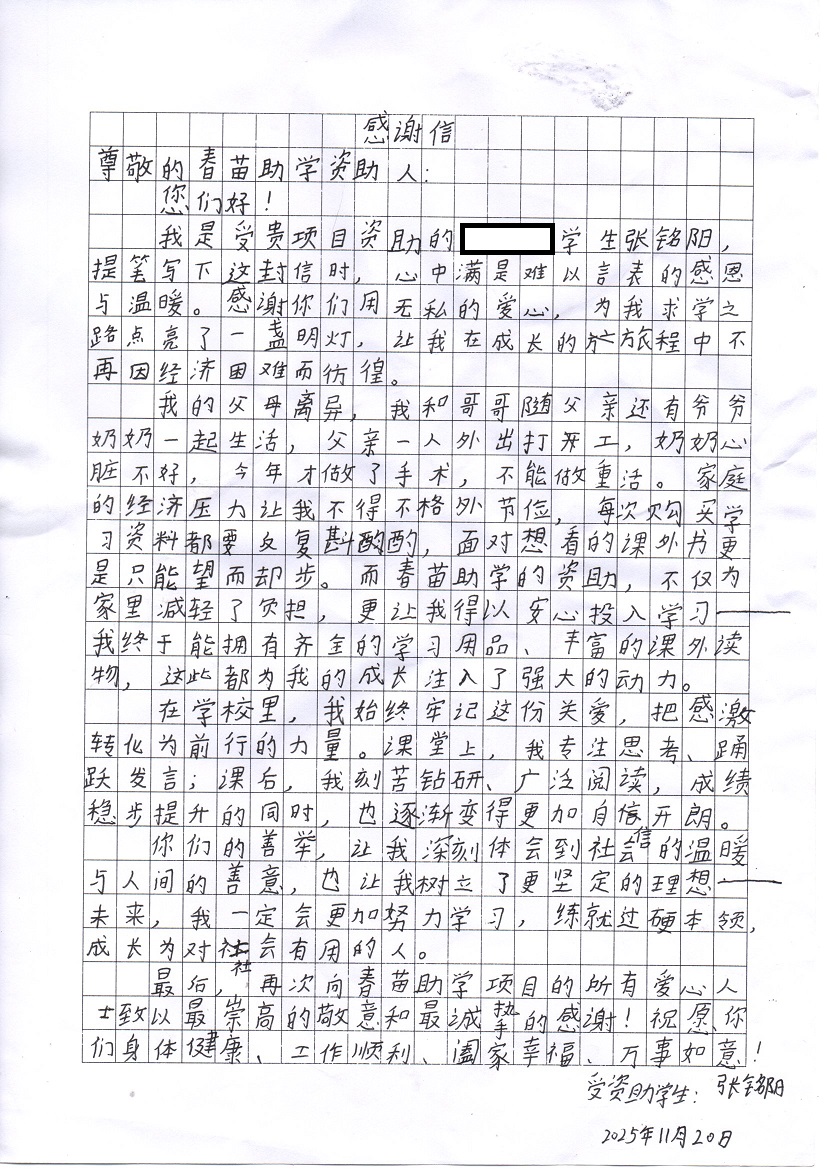 【原创】 【原创】 受助学生反馈信:张铭阳