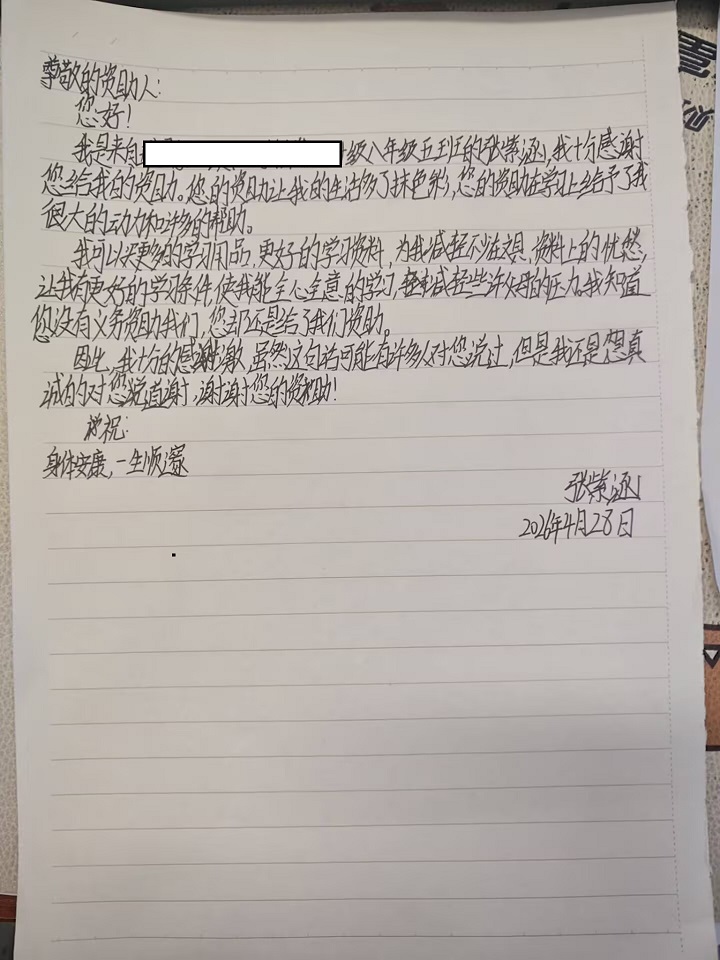 【原创】 【原创】 受助学生反馈信:张紫涵