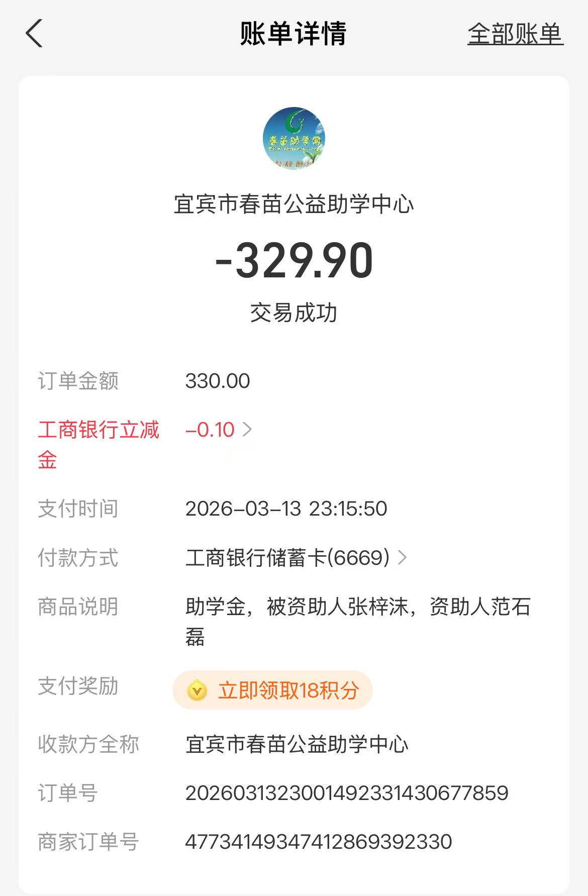 【原创】 已通过支付宝支付张梓沫同学助学金