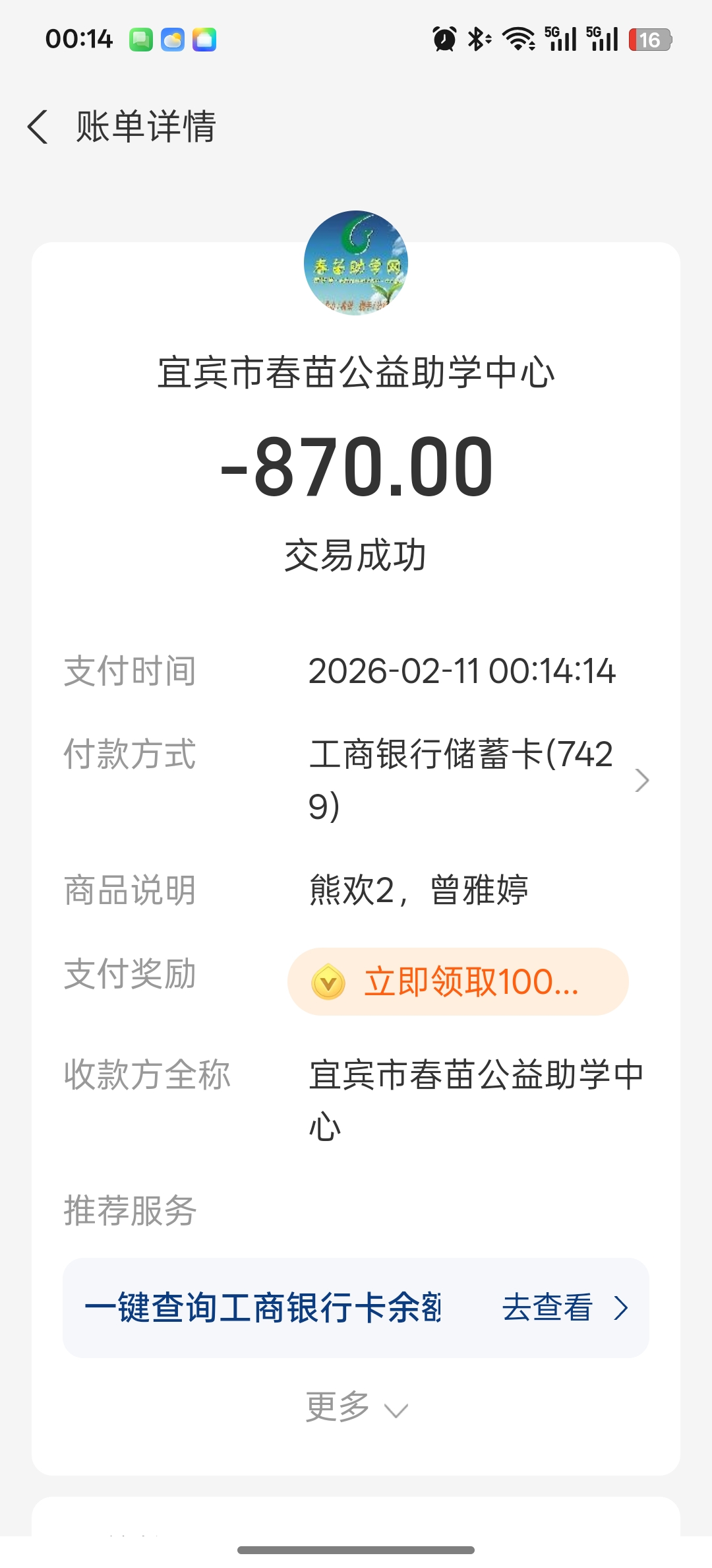 【原创】 继续资助曾雅婷,熊欢2一年