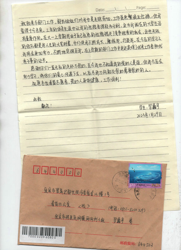 受助学生反馈信: 罗鑫宇