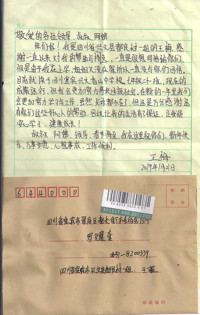 受助学生反馈信:王梅