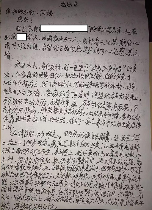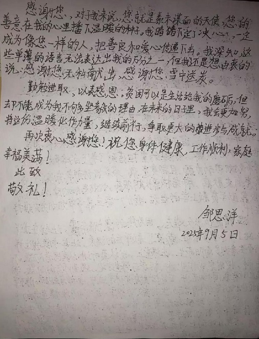 【原创】 【原创】 受助学生反馈信:邹思洋