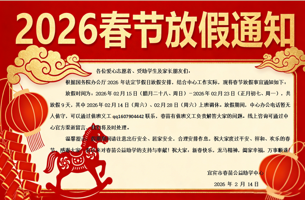 【原创】 宜宾市春苗公益助学中心2026年春节放假安排