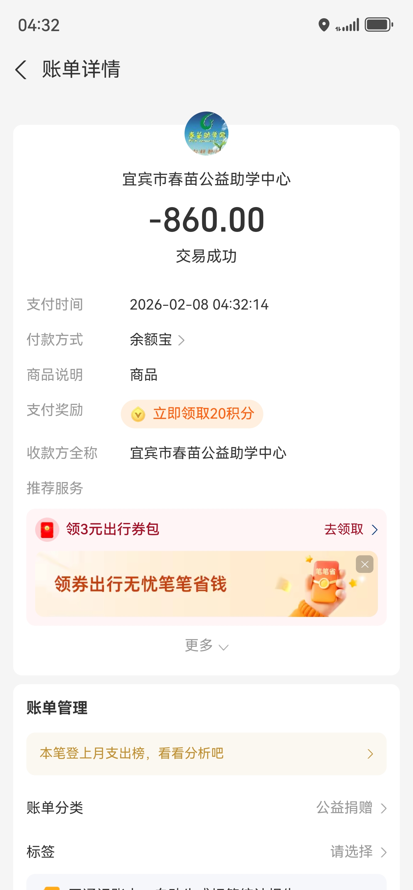 资助马俊飞,方中南各一年,通过支付宝账号转账支付了860元,时间2026年2月8日凌晨4点多
