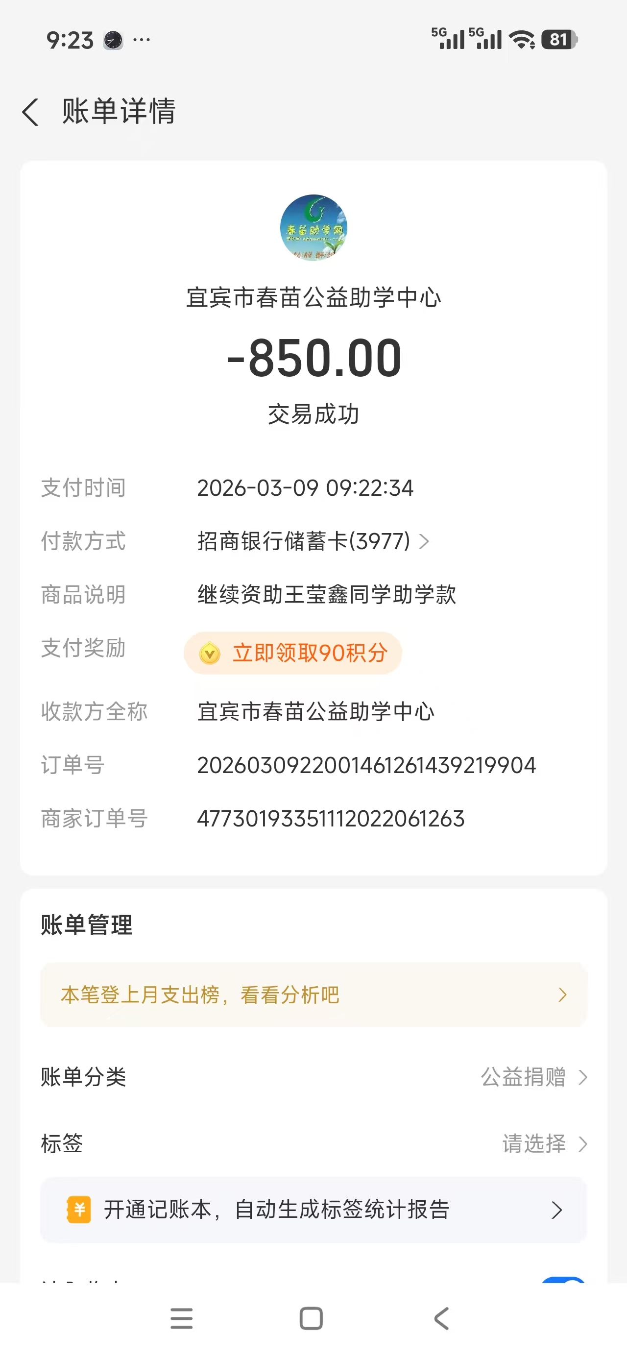 继续资助王莹鑫同学助学款850元已转账,请查收,谢谢。
