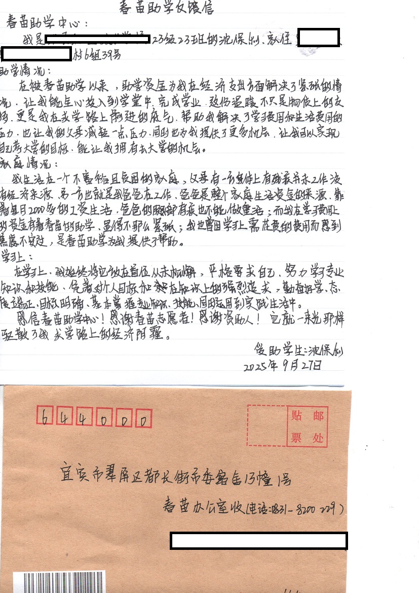 【原创】 【原创】 受助学生反馈信:沈保利