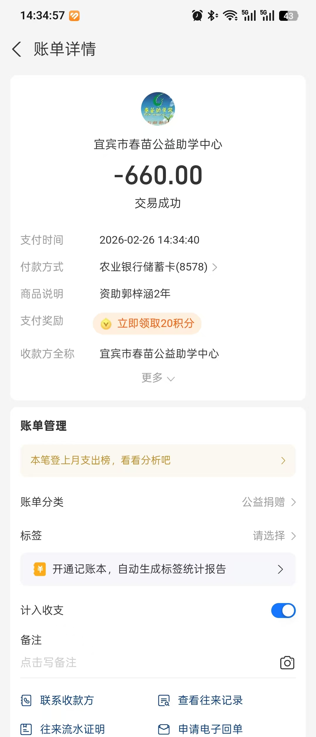 资助郭梓涵2年,已通过支付宝汇款