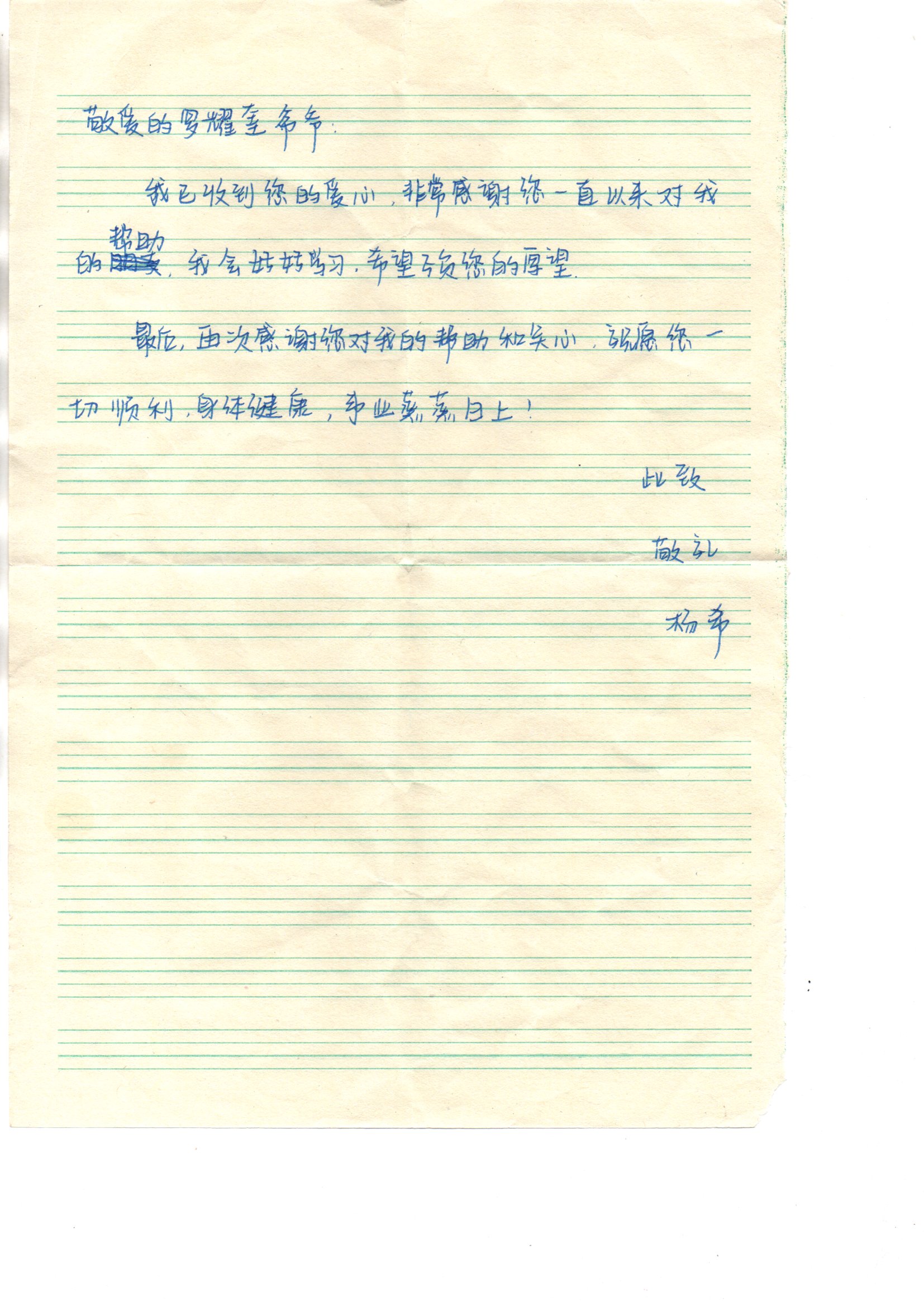 受助学生反馈信:杨希
