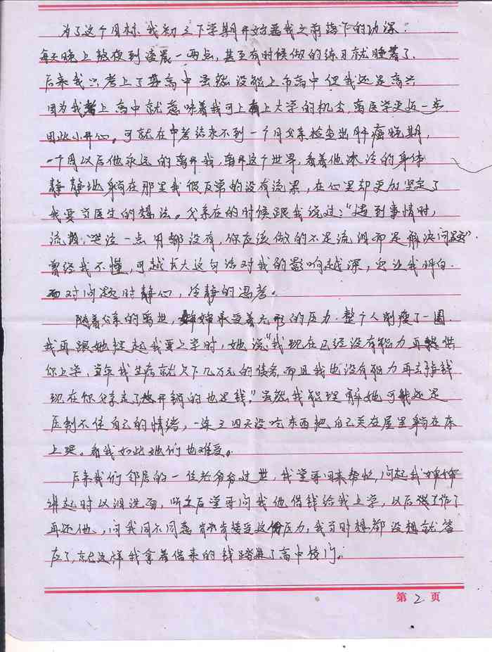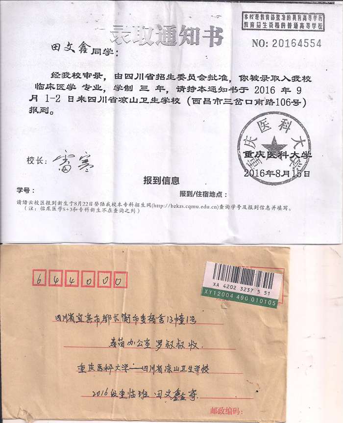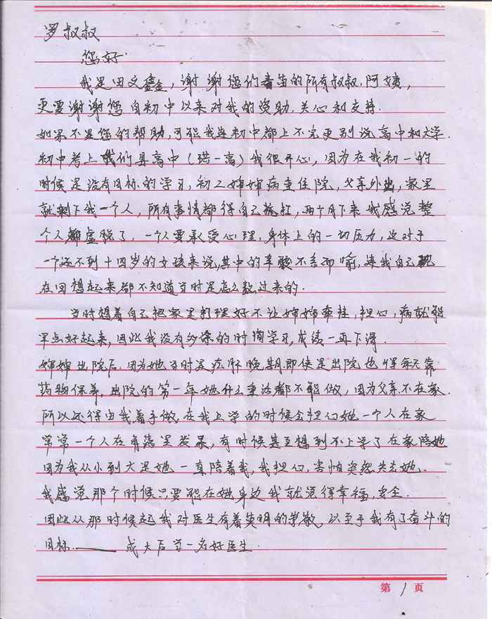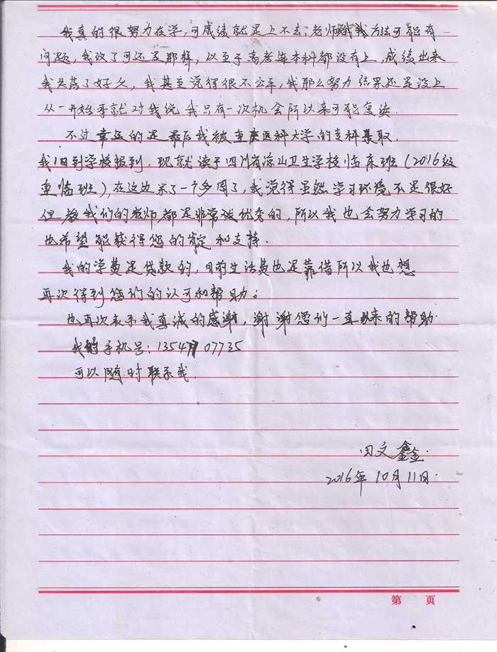 受助学生反馈信:田文鑫