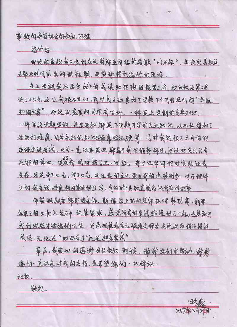 受助学生反馈信:田文鑫