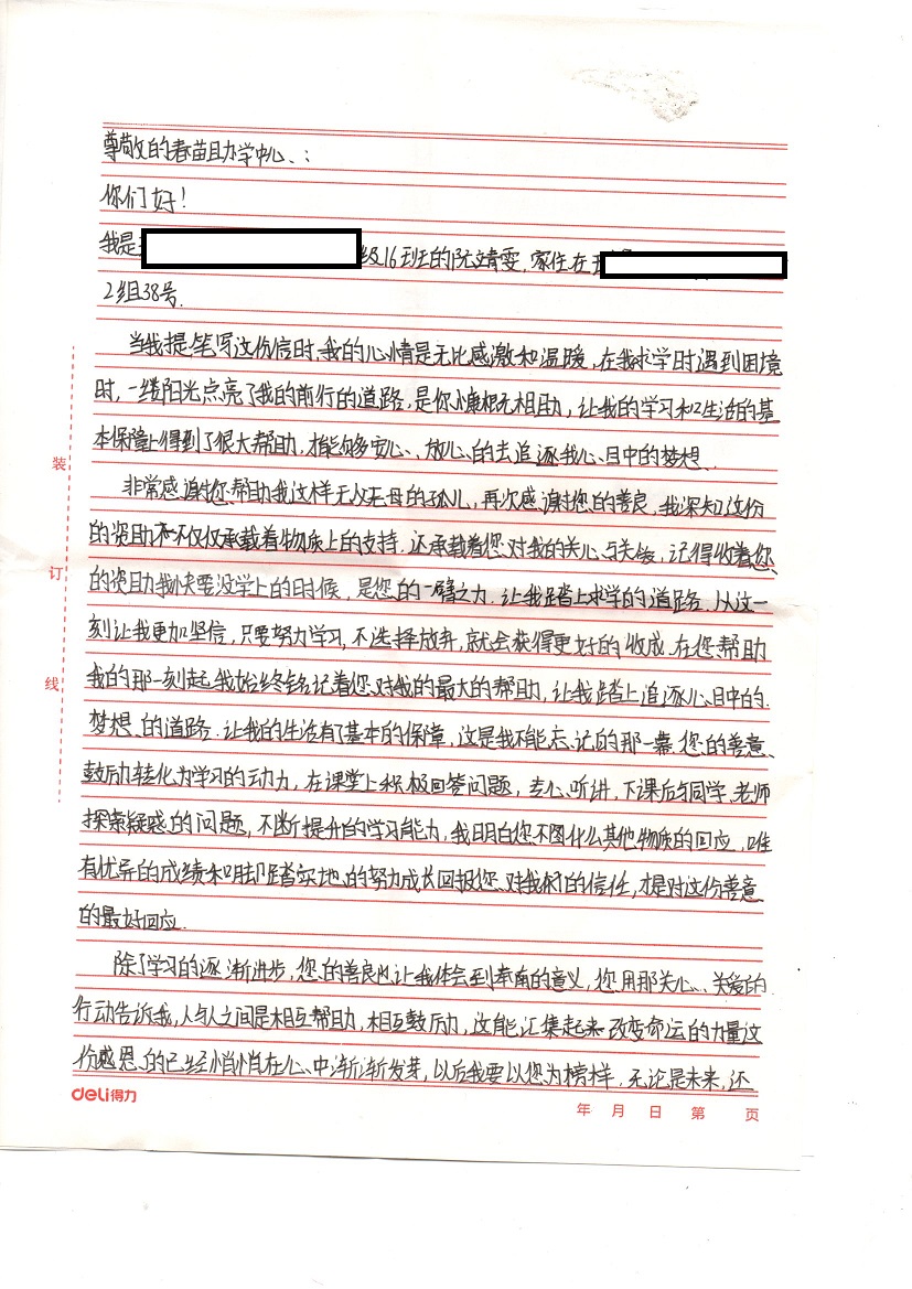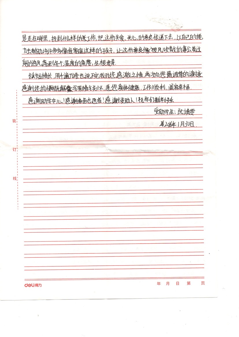 受助学生反馈信:阮靖雯