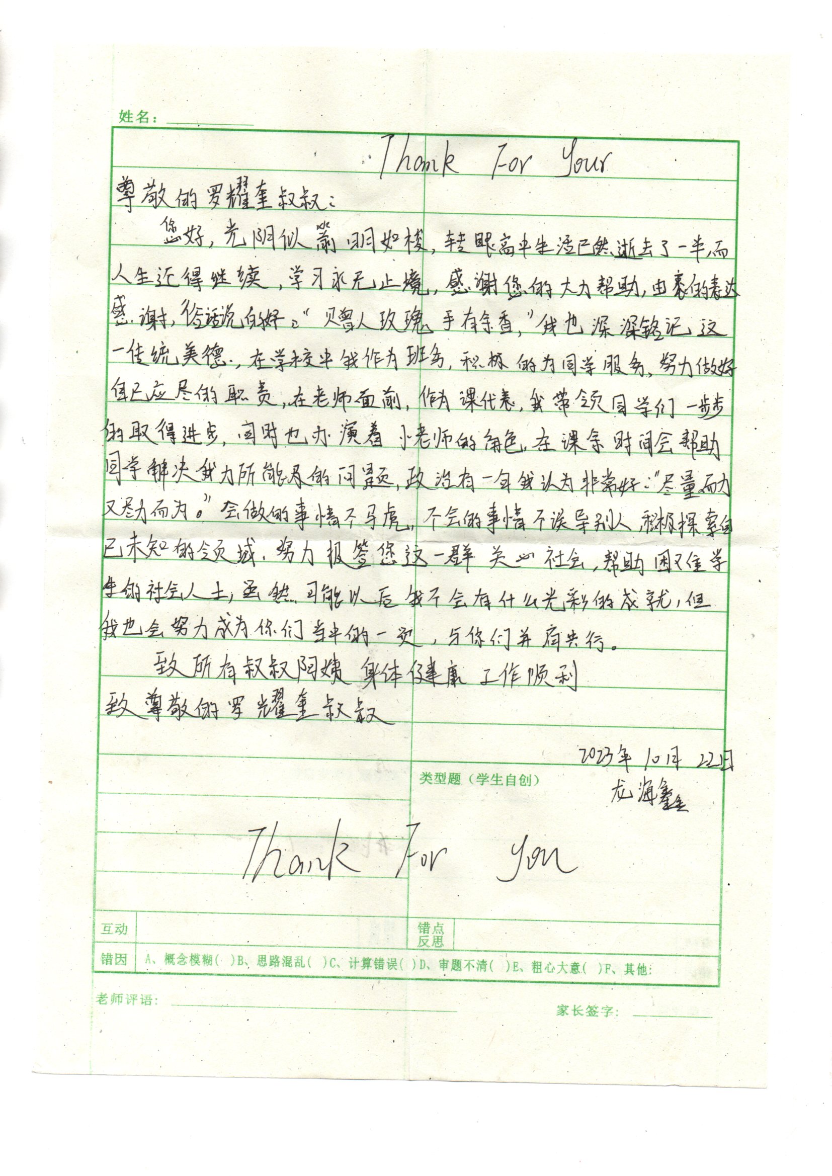 受助学生反馈信:龙海鑫