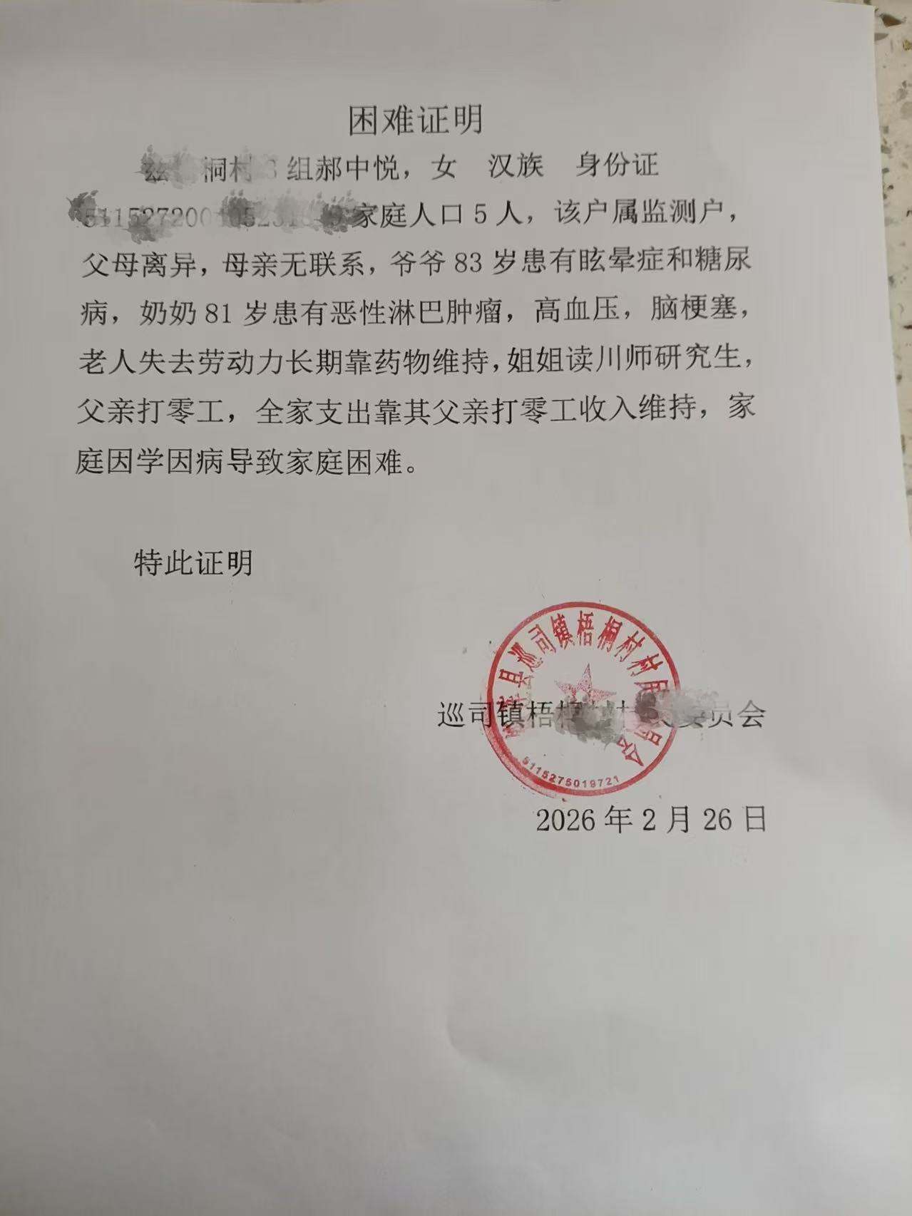 (大学二年级)该生家庭情况特殊,父母离异,全家仅靠父亲打零工维持生计,收入微薄且不稳定。家中两位老人均已八十多岁,无劳动能力,常年患病需长期服药。奶奶患有淋巴瘤、高血压、脑梗塞,需定期复查治疗;爷爷患有眩晕症、糖尿病,需药物控制,医疗开支巨大。该生与姐姐仍在校读书,教育、生活、医疗、赡养多重压力叠加,家庭经济十分困难,恳请予以帮扶。
