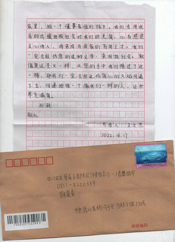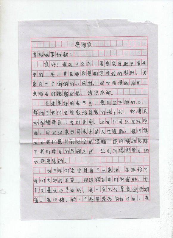 受助学生反馈信:王文杰