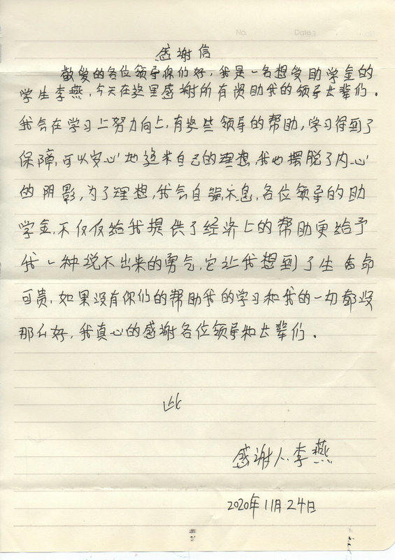 受助学生反馈信:李燕