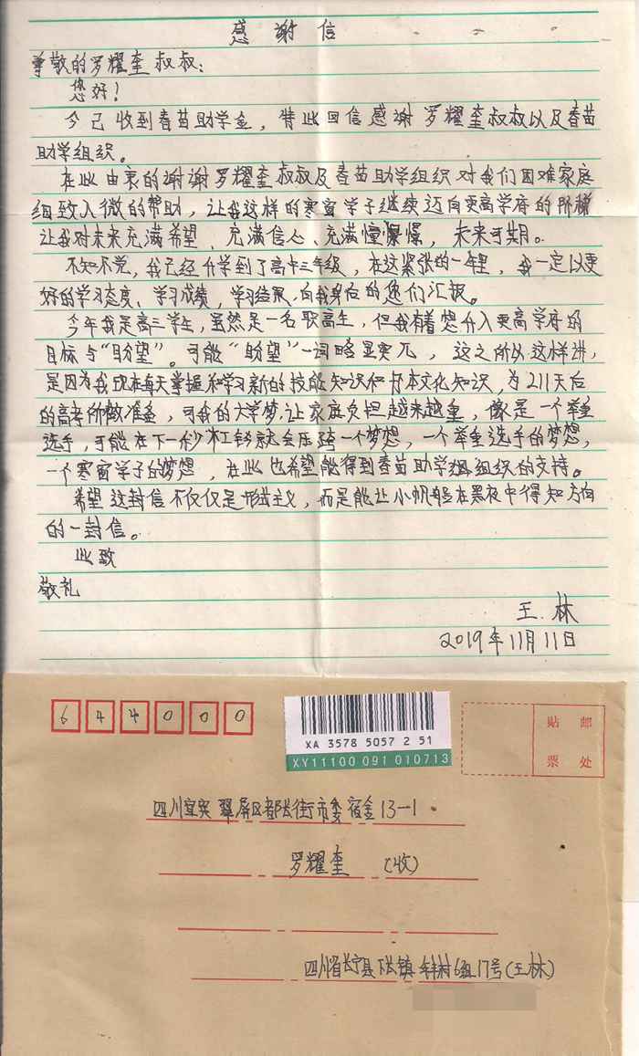 受助学生反馈信:王林