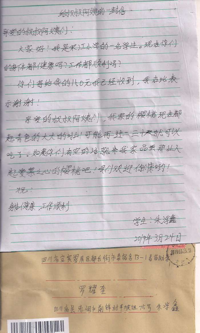 受助学生反馈信:朱浮鑫