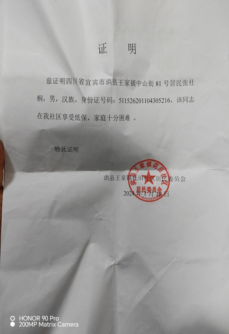 (中学2年级)学生张仕桐,生于珙县王家镇花田社区的一个乡镇低保户家庭,全家人口4人,其中:劳力1人,读书1人,父亲已经生病住院3年了,母亲因为跟父亲离婚,与家里无联系,奶奶年老,有高血压,常年吃药,家里并无耕地,基本上靠爷爷的微薄工资养家糊口,劳动力少,困难家庭。